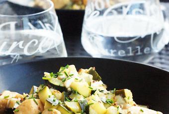 Un petit retour au souce avec cette recette, en effet les courgettes et le poulet c’est une des première chose que j’ai cuisine seule (j’avais 19 ans, je n’avais quasi jamais cuisiné avant ça XD) a l’époque je le fesait souvent (trés souvent même) et j’accompagnais avec du curry, sauf que l’amoureux n’aime pas trop le curry (et il commence même a l’apprécier, j’y arriverais ^^) du coup j’ai changé ma recette de base et j’ai ajouté de la féta pour le coté fraîcheur estivale (j’adddooorrree la féta, l’an dernier j’en ai beaucoup fait a ça a l’air encore bien parti pour cette année)