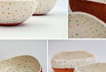 Dans sa boutique Etsy, elle propose des bols et des plats mélangeant 2 finitions : l'extérieur plutôt brut et l'intérieur blanc à pois multicolores :