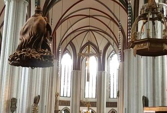 Aujourd’hui, on est frappé par la beauté des volumes, la blancheur des voûtes et le choix des couleurs – vert, rouge, violet – des arêtes d’ogives. On imagine ce que fut l’autel baroque à travers les quelques morceaux que l’on a pu reconstituer dans les décombres et qui ont été replacés en suspension, on admire aussi les belles chapelles funéraires qui ornent ses bas-côtés.