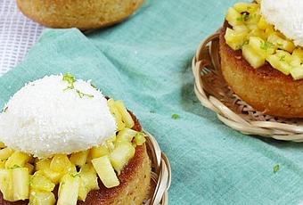 - Répartir l'ananas sur toute la surface des petits gâteaux, puis disposer les quenelles de mascarpone au milieu.
