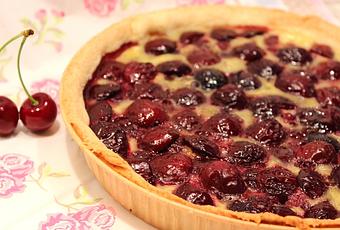 Étalez la pâte dans un moule à tarte et piquez-la à l'aide d'une fourchette. Saupoudrez le fond de la tarte de poudre d'amande et déposez les cerises par-dessus.
