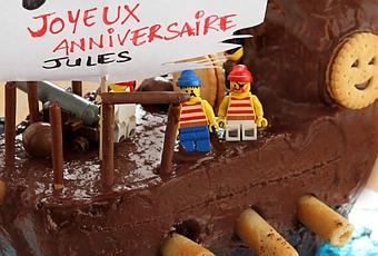 Ce gâteau qui m'a donné du fil à retordre date du mois de mars (toujours un peu de retard sur mes recettes.... lol). J'avais promis à mon neveu de lui faire un gâteau de pirates. Il était à fond dans les pirates. Je lui avais acheté à noël un costume d'ailleurs. Pourquoi ai-je fait ça? lol Une galère. Quand on a un petit bébé, c'est un peu plus dur de rester plus de 1h en cuisine d'affilé. Bref, j'ai dû le faire 2 fois... Je n'ai pas laissé refroidir ma génoise, donc à la découpe c'était pas top. Une fois que je l'ai glacée et percée pour les canons. Le gâteau s'est fendu en 2 ! Oh la la ! C'était pour le lendemain quand même ! En me "speedant" j'ai fait une autre génoise et là c'était pas trop mal. Mais tout a été fait à la va vite. J'étais déçue... Snif snif... Mon neveu Jules a adoré et il était tout fier. Ça m'a fait trop plaisir. En tout si vous vous lancez dans cette expérience, n'hésitez pas à prendre votre temps. Je suis certaine que le résultat sera bien plus bluffant que le mien. ;-)