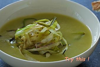 Répartir la soupe entre 4 bols. Déposer au centre un nid d'effilochés.