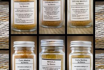 Kit comprenant : Garam Masala (40 g), Masala (40 g), Tandoori (40 g), Curry Bombay (40 g), Curry Madras (40 g), Byriani Masala (40 g).