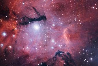 Distante d’environ 3 000 années-lumière de nous en direction des Voiles (Vela), Gum 15 est également le théâtre d’étoiles en gestation au sein de notre galaxie. Elle doit en partie sa physionomie et sa couleur rouge/rose caractéristique aux tumultes d’une poignée d’étoiles massives de l’amas Collinder 197. L’une d’elle, nommée HD 74804, brille intensément près du centre de l’image. Son rayonnement violent n’a de cesse d’éroder et crevasser les parois du nuage moléculaire où abonde l’hydrogène. Ionisé, celui-ci rougeoie sous l’influence de la jeune étoile. Peu à peu, le paysage se transforme. Il faudra toutefois patienter plusieurs millions d’années avant d’y voir éclore de nouvelles générations d’étoiles. Les échancrures sombres ne sont autres que des recoins riches en poussières.