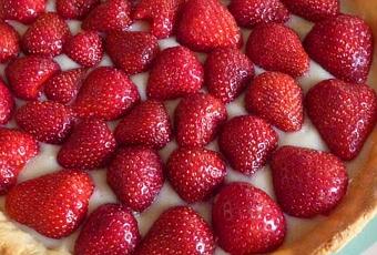 Laver les fraises et bien les égoutter. Equeuter les fraises et les couper en deux. Disposer les moitiés de fraises sur la tarte.Réserver au réfrigérateur et sortir 15-20 min avant de servir (afin que la tarte ne soit pas trop froide).