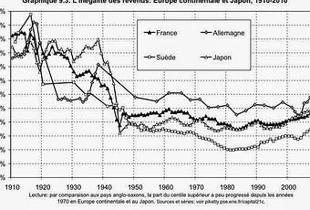 Arrêtons-nous maintenant sur une comparaison au sein des pays développés entre les pays anglo-saxons versus les autres, car depuis les années 70, nous vivons une évolution divergente.Du côté des pays anglo-saxons, les inégalités de revenus se creusent.Ainsi selon les calculs de Thomas Piketty, « si l’on cumule la croissance totale de l’économie américaine au cours des trente années précédant la crise, c’est-à-dire de 1977 à 2007, alors on constate que les 10 % les plus riches se sont approprié les trois quarts de cette croissance ; à eux seuls, les 1 % les plus riches ont absorbé près de 60 % de la croissance totale du revenu national américain sur cette période ; pour les 90 % restants, le taux de croissance du revenu moyen a été ainsi réduit à moins de 0,5 % par an. »Bien plus, c’est le millième supérieur qui a capté l’essentiel : à eux seuls, ils ont absorbé plus de 30% cette croissance. Qui sont-ils ? D’abord des cadres dirigeants, et seulement pour moins de 5%, des sportifs, acteurs ou artistes. D’où une nouvelle formule de Piketty, concernant les USA : « Les nouvelles inégalités américaines correspondent bien plus à l’avènement des « super-cadres » qu’à une société de « superstars ». »Cette évolution, on la retrouve dans les autres pays anglo-saxons, mais deux à trois fois moins forte.A l’inverse dans les autres pays développés, aussi bien en Europe qu’au Japon, on ne retrouve pas cette évolution : la part du centile supérieur est sensiblement stable depuis les années 70, ce qui signifie que la captation des revenus s’est fait à due proportion de sa situation antérieure. Les inégalités ne diminuent, ni se creusent.Même remarque pour le millime supérieur. Ainsi les salaires extrêmement élevés de quelques cadres dirigeants y sont suffisamment rares pour que ceci ne se traduise pas dans les indicateurs macroéconomiques.En résumé, dans les pays anglo-saxons, l’inégalité des revenus a retrouvé ou est en passe de retrouver les niveaux records des années 1910-1920, alors qu’en Europe continentale et au Japon, elle est beaucoup plus faible et a peu changé depuis 1945.Ceci est bien résumé par la comparaison entre les États-Unis et l’Europe : la part du décile supérieur évolue de façon synchrone jusqu’en 1970, puis diverge. En 2010, le décile supérieur représente près de 50% des revenus aux USA, contre 35% en Europe.(à suivre)