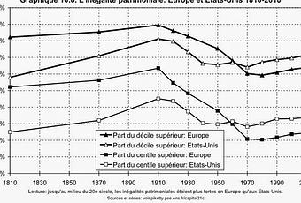 Que dire de la comparaison entre Europe et États-Unis ?D’abord une inversion des positions : l’Europe de 1910 était nettement plus inégalitaire que les États-Unis, le décile supérieur y détenant plus de 60% des biens contre 45%. Cent ans plus tard, de partout les inégalités ont diminué, mais nettement moins aux USA qui se retrouvent plus inégalitaires, avec 35% détenu par le décile supérieur contre 25% en Europe.Selon Thomas Piketty, c’est cette forte réduction des inégalités, couplée avec la forte croissance qui est à l’origine de l’image si positive des Trente Glorieuses sur le vieux continent : « On a l’impression d’avoir dépassé le capitalisme, les inégalités et la société de classes du passé ». Et comme depuis la croissance s’est enrayée et que les inégalités ne régressent plus, nous serions en train de vivre le temps de désillusion. Thèse intéressante et probablement pertinente…(à suivre)