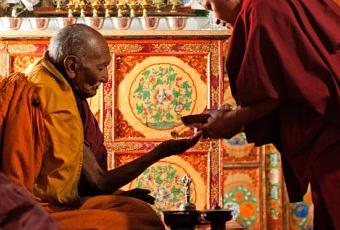 Deux ou trois religieux circulent entre les rangs, soit pour servir du thé salé au beurre ou de la tsampa, soit pour exécuter des rites associés aux prières.