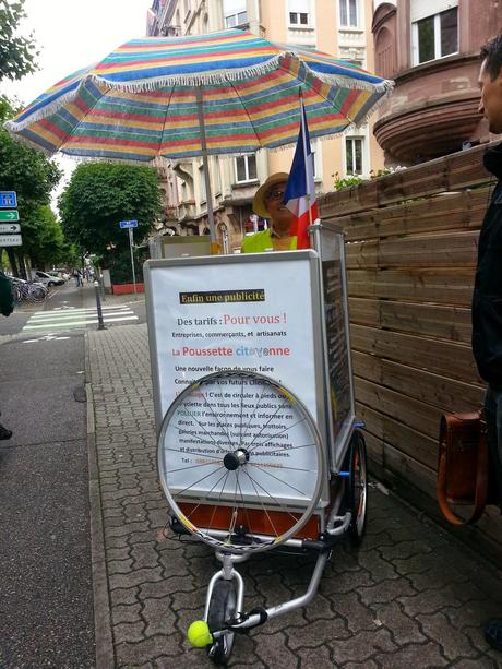 Joseph LOUKIL : " La Poussette Citoyenne est une création strasbourgeoise de communication de Street Marketing Publicitaire. C'est dispositif de trois panneaux d'affichage de dimension 60 x 80 cm, plus un dispositif de stockage : prospectus, dépliants et échantillons de produits divers.Une tournée mobile dans des lieux choisis définis avec le commanditaire: tout rassemblement public, secteurs piétonniers, manifestations, foires expositions, galeries marchandes et centre commerciaux (selon autorisation)."