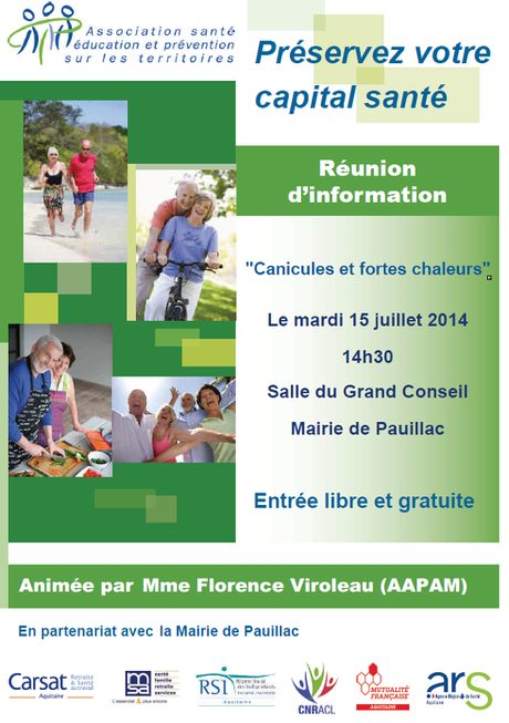 Une réunion d'information ."Canicules et fortes chaleurs" se déroulera le mardi 15 juillet 2014 à 14h30 dans la salle du Grand Conseil de la Mairie de Pauillac. L'entrée est libre et gratuite.
