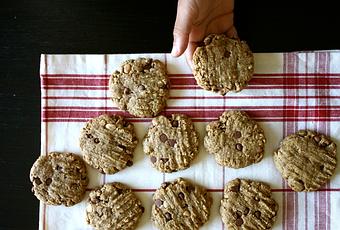 Mélanger les ingrédients secs. Ajouter le beurre de cacahuètes, l'huile d'olive, la compote et les pépites de chocolat. Bien mélanger pour former une boule de pâte, ajouter un peu de lait végétal si besoin.