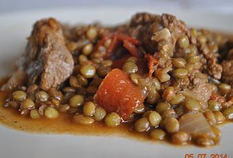 Couvrir d’eau de 2 fois l’équivalent des lentilles et de la garniture, couvrir et laisser cuire sur feu moyen 40 minutes en mélangeant de temps en temps.