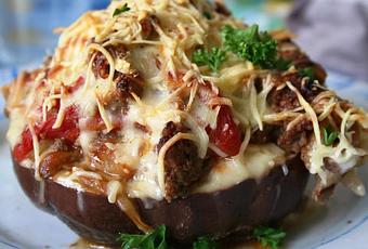 Répartir la moitié de la béchamel dans les coques d'aubergines, ajouter la viande hachée et finir par une couche de béchamel, saupoudrer du reste de gruyère. Cuire 20 minutes au four préchauffé à 220°C. Décorer d'aneth.