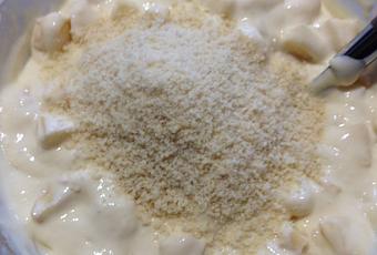 Ajoutez enfin les dés de pommes et la poudre d'amandes. Mélangez.