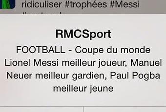 La mode des joueurs PlayStation... La star Crisitiano Ronaldo ayant été vite éliminée, récompensons la star Messi. Avant un ballon d'or en fin de l'année, pour finir de décrédibiliser totalement cette récompense ? C'est affligeant.C'est même insultant pour Thomas Muller (moins bancable), pour Robben, Neuer ou Di Maria, en ne citant qu'eux. Mais ils sont moins "star" que la star Messi, qui n'a pas marché sur l'eau sur les 3 derniers matchs...Et Paul Pogba meilleur jeune ? Là encore c'est délirant. La FIFA n'a vu que les 10 dernières minutes d'un seul match. Pogba a été nul en poule, et inexistant contre l'Allemagne. Mais il est le meilleur jeune du tournoi. Il faut le vivre...