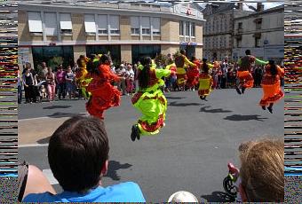 C’est donc sur les coups de 11 heures, ce lundi matin, que je me suis lancé dans la foule en guettant chaque signe pouvant m’indiquer le parcours du défilé, que j’ignorais parfaitement ; vous constaterez la préparation méthodique en amont de ce reportage… Heureusement pour moi, des dizaines de danseurs folkloriques accompagnés de tambours et autres percussions, ça ne passe pas tout-à-fait inaperçu. Me guidant surtout à l’oreille, je finis par atterrir aux alentours du pont Bernard Palissy.