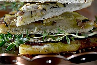 Étalez votre pâte à pizza, tâpissez-la de purée d'aubergine et recouvrez de rondelles de courgette coupées très finement. À l'aide d'un pinceau, passez un peu d'huile d'olive sur le dessus et saupoudrez légèrement de graines de sésame. Salez et poivrez. Ajoutez quelques herbes fraîches.