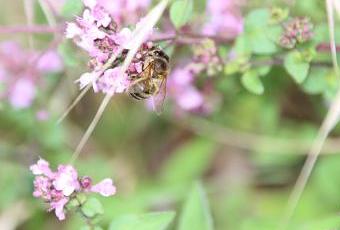 Il y a quelques années j’avais planté de l’origan à Veneux dans une zone ensoleillée. Cela ne lui a pas plu, il a végété, il n’en reste qu’un ou deux brins mais cela a suffi pour qu’il se ressème là où ça lui convient, à un mètre du lieu d'origine, de l’autre côté de la grosse dalle du compteur d’eau, au pied de la boite aux lettres. Le soleil a refait son apparition ce matin et il a aussitôt été couvert d’abeilles