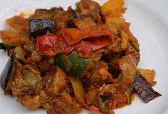 Ajouter les épices, le sel, la gousse d’ail pressée, les feuilles de laurier, et le concentré de tomates sur les légumes, arroser avec l’huile d’olive, mélanger.