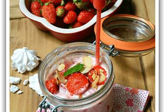 Mettez la meringue, la crème mélangée à la pulpe de fraise au fond des verres, + des fraises en déco