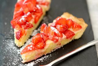 Couper les fraises en petits morceaux et faire mariner avec le jus de citron et un peu de sucre pendant 30min au frigo.Pour le dressage, attendre que tout soit bien froid : Remplir le fond de tarte avec la crème pâtissière, puis recouvrir avec les fraises (sans le jus rendu). Décorer avec un peu de sucre glace et le tour est joué!