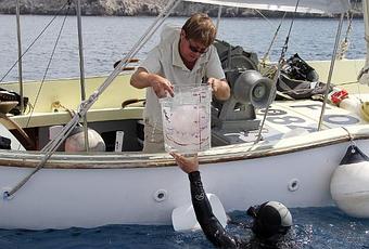 Un plongeur de l'Observatoire Océanologique de Villefranche-sur-Mer donne à un collègue une méduse capturée dans la Méditerranée, le 6 juillet 2012 (Photo Valery Hache. AFP)
