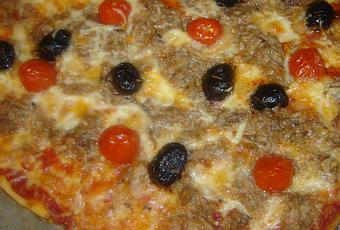 Etalez votre coulis sur la pâte (pas sur les bords), placez quelque dés de mozzarella puis du gruyére et enfin votre thon. Mettre des tomates cerises coupées en deux et des olives noires.
