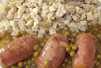 Dans une sauteuse faire dorer l’oignon émincé dans un peu d’huile d’olive, ajoutez les diots et faire revenir le tout.