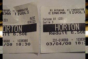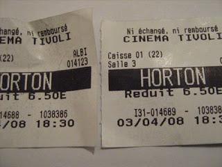 Nicole et moi décidons d'aller voir un dessin animé - pardon, un film d'animation. L'éléphant Horton nous a séduits. Nous nous sommes marrés comme des baleines (des pachydermes), nous sommes retombés en enfance. Une seule séance aujourd'hui à 18h30. 4 spectateurs. Film "à partir de 6 ans". 4 adultes dans la salle. Mignon, drôle. Seul bémol, cette manie de finir en chanson...