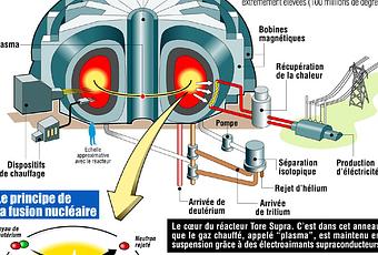 Dans le cas d'ITER, la réaction de fusion se produira dans un tokamak, une machine qui utilise des champs magnétiques pour confiner et contrôler le plasma chaud. La fusion du deutérium et du tritium (D-T) produira un noyau d'hélium, un neutron et de l'énergie.Le noyau d'hélium est porteur d'une charge électrique. Il sera donc soumis aux champs magnétiques du tokamak et restera ainsi confiné dans le plasma. Toutefois, 80 % environ de l'énergie produite sera emportée hors du plasma par le neutron qui, n'étant pas chargé électriquement, demeurera insensible aux champs magnétiques. Les neutrons seront absorbés par les parois du tokamak, transférant leur énergie à ces dernières sous forme de chaleur.