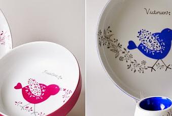 "COCO", la vaisselle complète consiste en une assiette, un bol et un coquetier; c'est à vous de choisir le nombre de pièces que vous souhaitez offrir, ainsi que la couleur; entre rose bonbon, turquoise, vert d'eau, vert anis, jaune, lin, et maintenant , une nouvelle couleur : indigo ! (qui ne ressort pas très fidèlement sur l'image … dommage)