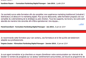 Nous proposons tous les mois une formation réalisée par 6 professionnels en exercice qui partagent leur savoir-faire dans ces domaines. Cette formation s’intitule Marketing Digital Manager et est organisée sous forme de 14 webinaires de 2H en DIRECT avec les formateurs, à raison de 3 webinaires par semaine assortie d’exercices corrigés par les formateurs.