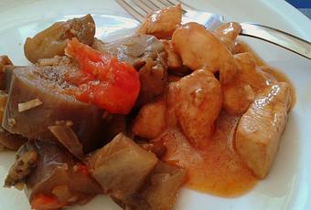 Pelez la tomate, coupez en morceaux (même grosseur que les aubergines).
