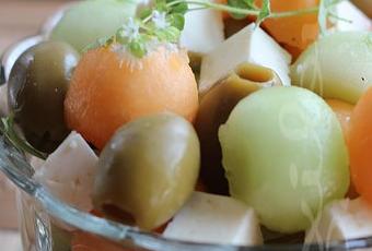 3)Dans le saladier, déposer les boules de melon et remuer. Ajouter les olives et les dés de feta. Remuer délicatement. Réserver au frais jusqu'au moment de servir.