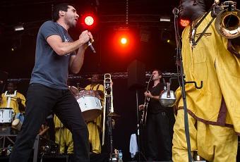 A peine le temps de reprendre son souffle que commence déjà le concert des Ogres de Barback. Déjà 20 ans que le groupe existe et distille sa joie de vivre et sa bonne humeur sur les scènes de France et de Navarre. Les quatre Ogres débutent seuls avec « Vous M’Emmerdez ! » et le public leur montre qu’il n’a pas l’intention de s’emmerder. Comme à leur habitude, les Ogres de Barback alternent les instruments : guitare, grosse caisse, trompette, tuba, accordéon et j’en passe. La voix rauque de Fred Burguiere fait le reste. Le public est conquis et il ovationne les trouvailles du groupe, comme ce solo de claquettes qui claque ! Après quelques titres, les Ogres sont rejoints par la Fanfare Eyo’nlé, huit musiciens qui mélangent les cuivres, tambours et percussions africaines. Sur les premières chansons, les cuivres prennent un peu trop le pas sur la musique des Ogres et on sent le public un peu décontenancé. Mais cela ne dure pas et les Ogres de Barback finissent leur concert accompagnés à merveille par cette fanfare originale.