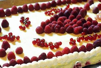 Déposer une couche de crème puis une couche de framboise et enfin une couche de crème.
