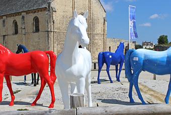 Non je viens souligner une initiative des Vitrines de Caen et de l’Office de Tourisme de Caen, soutenue par la Ville de Caen, La Cavalcade Multicolore. Le projet initial était de disposer 45 chevaux multicolores grandeur nature dans des quartiers de la ville et/ou des lieux à très fort trafic. Cette exposition éphémère et complètement inédite de chevaux de cire grandeur nature commença courant mai dernier dans les rues de Caen pour quasi aussitôt se stopper. En effet les quelques chevaux déjà prêts avaient été vandalisés (arrachés ou tagués !!). Après quelques temps de réflexion des organisateurs, les chevaux se sont donc installés au calme au Château Ducal laissant le temps à des élèves de lycée, des artistes locaux, des entreprises locales de décorer ou faire décorer leur cheval de cire.