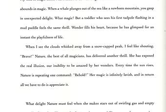 Quand je vois les nuages balayés au dessus d’une montagne au sommet enneigé, j’ai comme une envie de crier « Bravo ! » La Nature, la meilleure de toutes les magiciennes a délivré un nouveau frisson. Elle a révélé la vraie illusion, notre incapacité à être étonnés par ses merveilles. Chaque fois que le soleil se lève, la Nature répète un commandement : « Regardez ! » Sa magie est infiniment généreuse et en retour tout ce que nous avons à faire c’est apprécier.