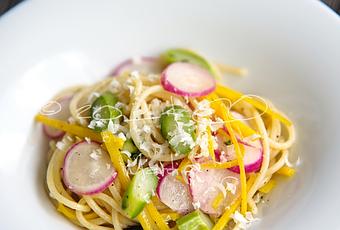 Pour faire la pâte à pâte : dans un bol, tout mélanger à la main pour obtenir une pâte non collante, au besoin, ajouter un peu d’eau ou de farine (cela dépend surtout de la taille de votre œuf) Former une boule, mettre dans du papier sulfurisé et laisser reposer au frigo 30min. C’est beaucoup plus simple avec un laminoir pour faire des pâtes, mais cela peut aussi jouer à la main. Sur un plan de travail fariné, étendre la pâte très finement au rouleau, puis à l’aide d’un bon couteau, faire des nouilles/spaghetti (plus facile de faire des nouilles à la main). Sinon à l’aide du laminoir, passer plusieurs fois la pâte pour obtenir une pâte bien fine (position 7 sur mon modèle) puis passer à l’ustensile spaghetti. Bien fariner les pâtes fraîches pour qu’elles ne collent pas ensemble ! Préparer les légumes : Pour les radis et la carotte, oignon nouveau, le passage à la poêle suffit, j’aime bien garder leur croquant ! Pour les asperges, une cuisson à l’anglaise (cuite à l’eau salée) et préférable pour avoir des légumes encore croquants, mais pas trop. Juste avant de cuire les pâtes, faire revenir les légumes dans une poêle avec une petite noix de beurre. Saler et ajouter le romarin (avec parcimonie, c’est une herbe puissante !) Faire chauffer un grand volume d’eau salée et faire cuire les pâtes al dente (2-3min, il faut goûter) et égoutter. Il faut que les légumes soient prêts à ce moment-là pour tout mélanger et servir sans attendre. Finir avec un peu de poivre, de parmesan et une tombée d’huile d’olive ! Simples pâtes, mais que c’est bon ! Copyright ©: Mes photos et mes textes sont protégés par un contrat Creative Commons. Merci de lire les conditions et de les respecter !