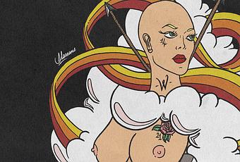 A : Modus Operandi : j’ai pris une feuille, un stylo et j’ai dessiné (sourire). Plus sérieusement ça faisait longtemps que j’avais pas testé un truc un peu nouveau, j’ai fait beaucoup de boulots de commandes cette année. J’aime les femmes, c’est un truc qui revient souvent dans mes dessins, j’aime les seins, les fesses, les nez fins, les lèvres pulpeuses. Ces attributs sont si parfaitement simples et simplement parfaits qu’ils sont super difficiles à reproduire. En l’occurrence, je me suis dit que la beauté c’était pas dans les cheveux, je voulais qu’on se concentre sur le visage, elle reste belle même sans cheveux. Je voulais dessiner une femme fière, forte, qui inspire la crainte et qui fascine en même temps, c’est une sorte de déesse, elle flotte dans un nuage, elle a des flèches dans le dos. Je t’avoue que c’est venu un peu comme ça, j’aime bien mélanger les trucs sérieux et légers, je ne suis pas très manichéen comme garçon.