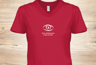 Je vous propose donc ma première création, en plusieurs modèles, couleurs et tailles, pour hommes et femmes. Elle porte l’inscription « On ne voit bien qu’avec les yeux du cœur… » sous un oeil dont l’intérieur est un coeur.