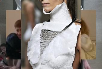 Eye, cette collection A/F 2014.15, est élaborée autour de pièces atypiques. Les matériaux insolites tels les chutes de Sari, l’insertion de nouvelles technologies (dispositif Brava, lecteur Audio, système éclairant articulé, clé USB, ) retranscrivent l’élaboration conceptuelle.