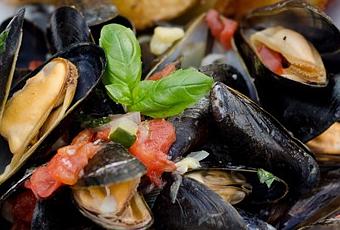 Après deux minutes, ajouter les tomates et le basilic grossièrement haché (ou déchiré à la main), et un trait d’huile d’olive. Remuer bien les moules pour uniformiser la cuisson.