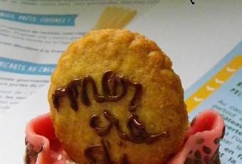 C'est sans doute ce qui m'a inspiré pour faire ce petit montage à partir de la Grande galette Saint-Michel qui existe depuis 1905.Nous avions à notre disposition quelques ingrédients comme des graines de lin ou de sésame, de la pâte d'amandes, des abricots secs, un stylo pour écrire au cacao, de la confiture de fraises et du caramel.