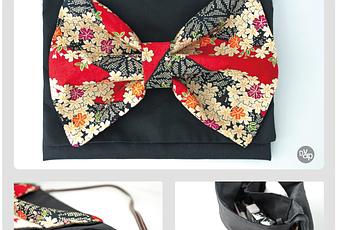 Je me jette à l’eau, je coupe le noeud, le coton noir et la doublure, je sors ma machine et je couds tout ça (avec une petite Poussinnette sur les genoux…). La pochette et le noeud sont doublés en polyester noir. J’ai également ajouté une petite anse pour le porter à l’épaule quand j’aurais une petite fille dans les bras…