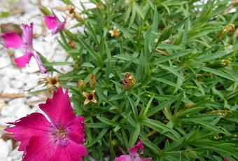 Encore en fleur, l’œillet conserve ses graines dans les cônes de fleurs fanées.