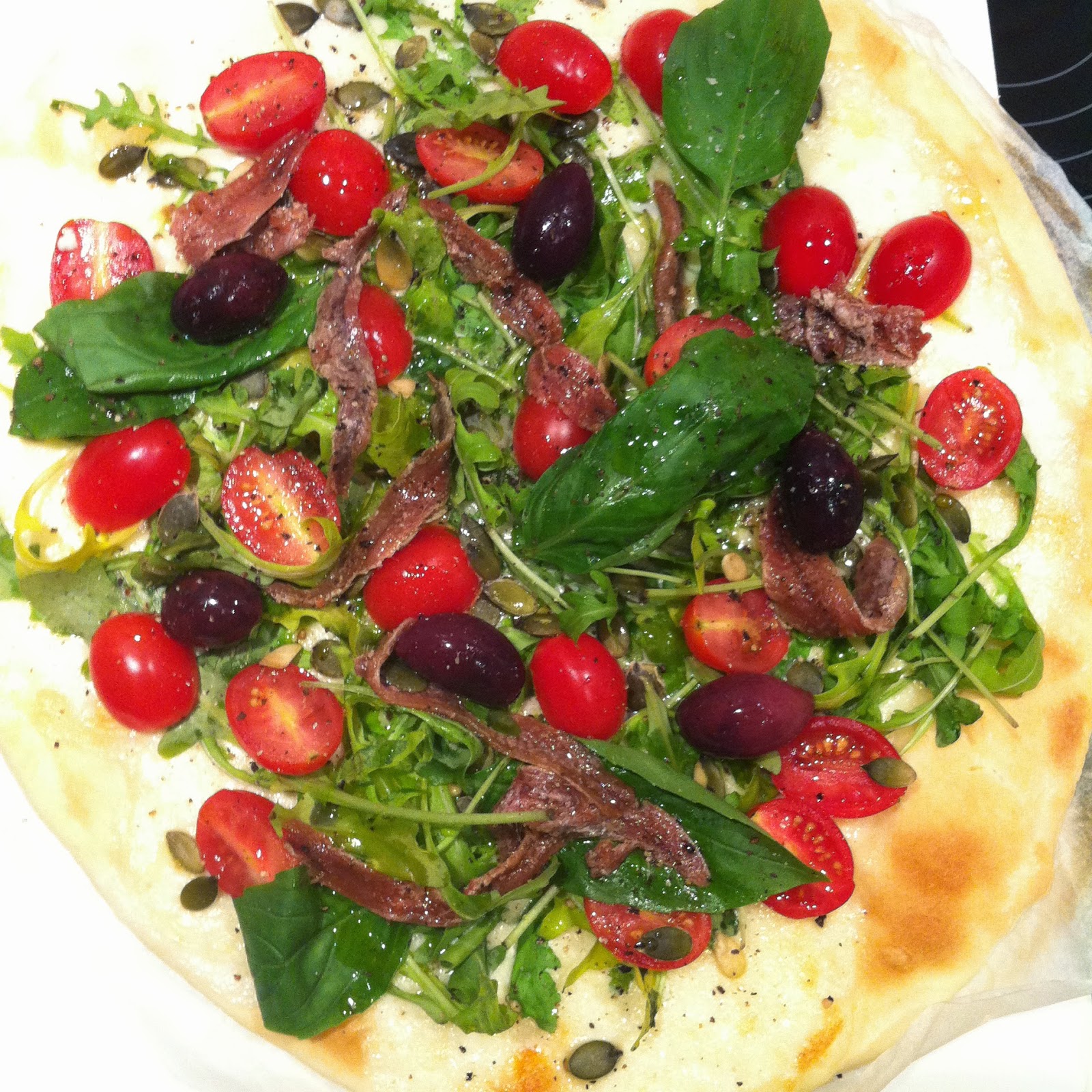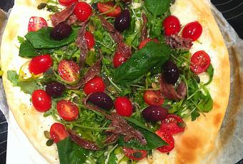 Mais vous pouvez aussi ajouter comme ici: des anchois, des olives, des tomates cerise, du basilic, des graines de courge...C'est vous qui décidez!