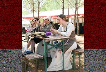 Nous commencons les activités avec trois charmantes dames qui se firent un plaisir de nous faire partager leurs connaissances en matières de tissus et d’habillement au Moyen-Âge. Une rencontre instructive dans tous les sens du terme car l’on nous propose de tisser nos propres bracelets et de nous initier au tissage sur métier à tisser ancien.