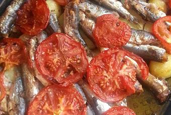Cuire vos pommes de terres dans l'eau salée et les couper en rondelles épaisses. Les placer sur une plaque huilée, puis mettre vos sardines par dessus et couvrir de tomates en rondelles.